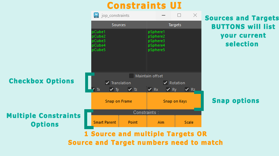 - Snap, Parent constraint and snap on Keys(MaintainOffset OFF) uses SMART Option : Checking if the target attributes are locked and only constraint the keyable attributes.